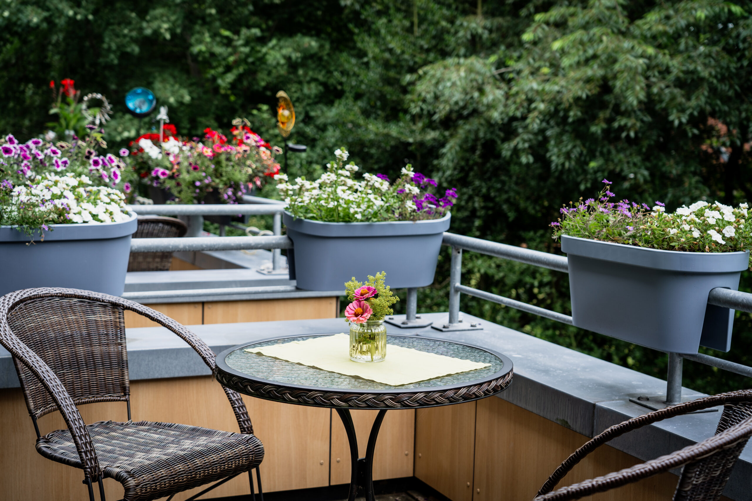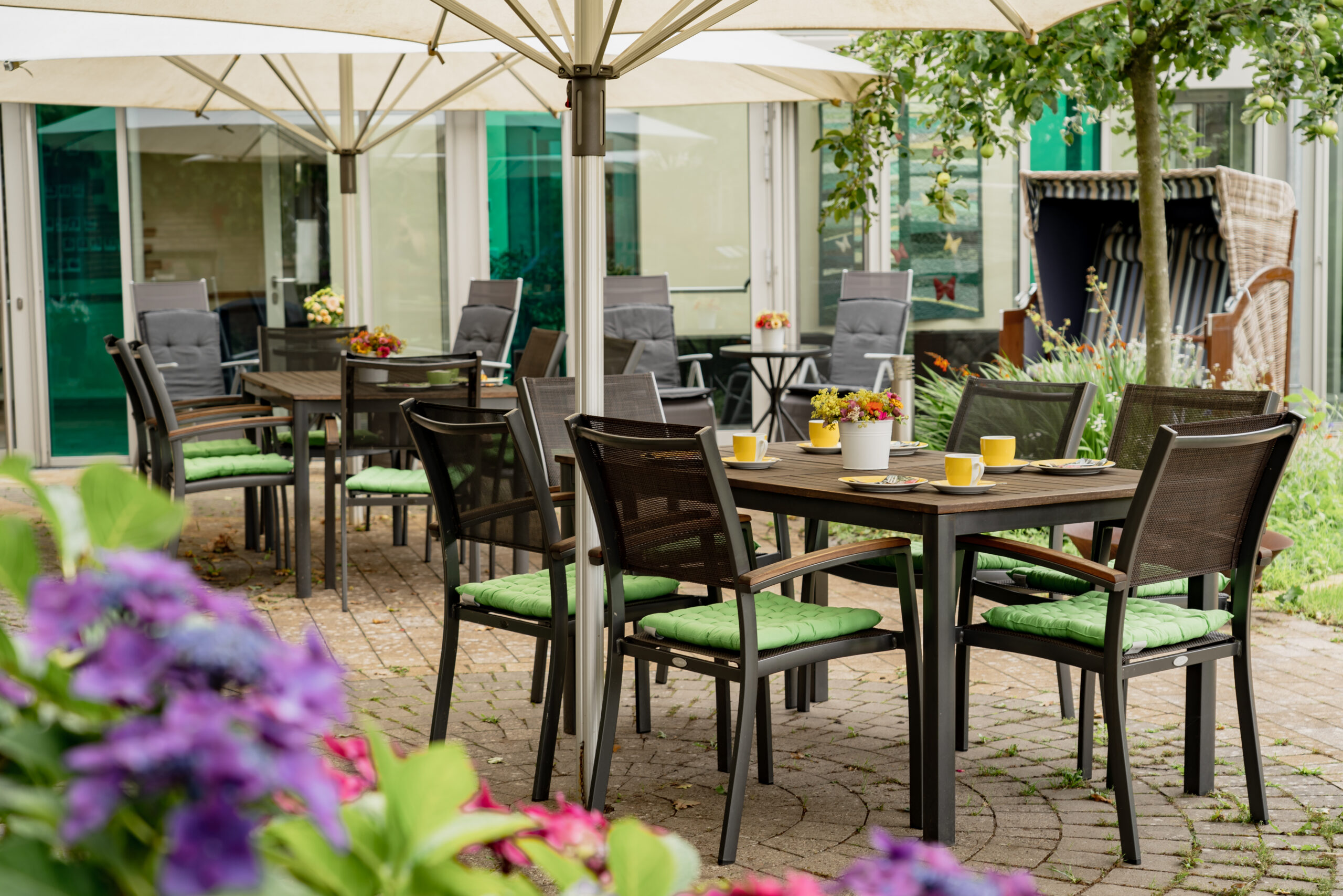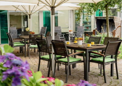 Im Sommer laden die Hauptterrasse, ein geschmackvoll angelegter Garten mit kleinen Sitzgruppen, Strandkorb und Gartenliegen Gäste zum Verweilen ein.
