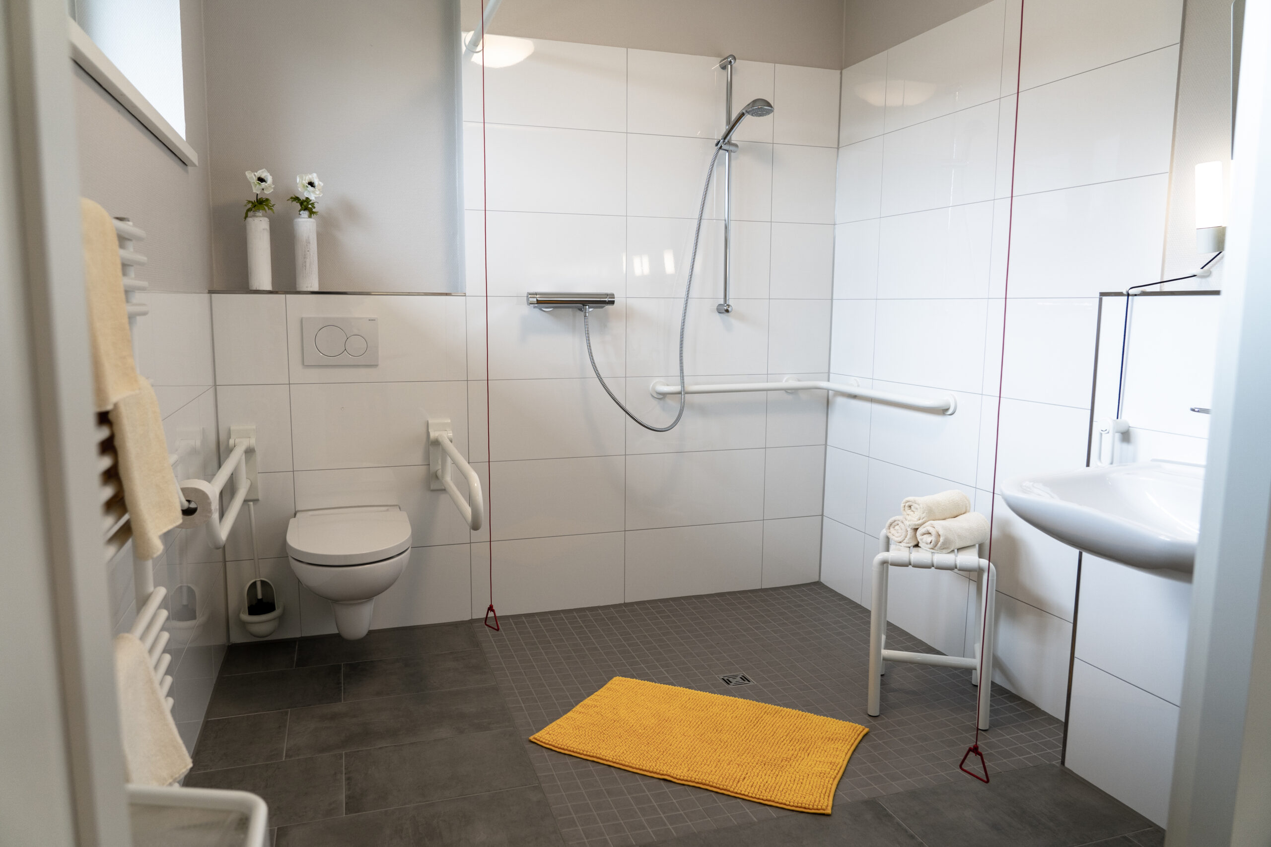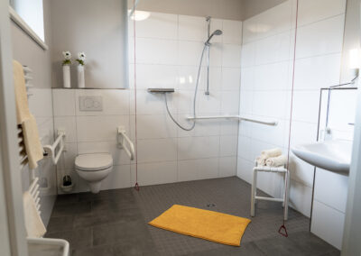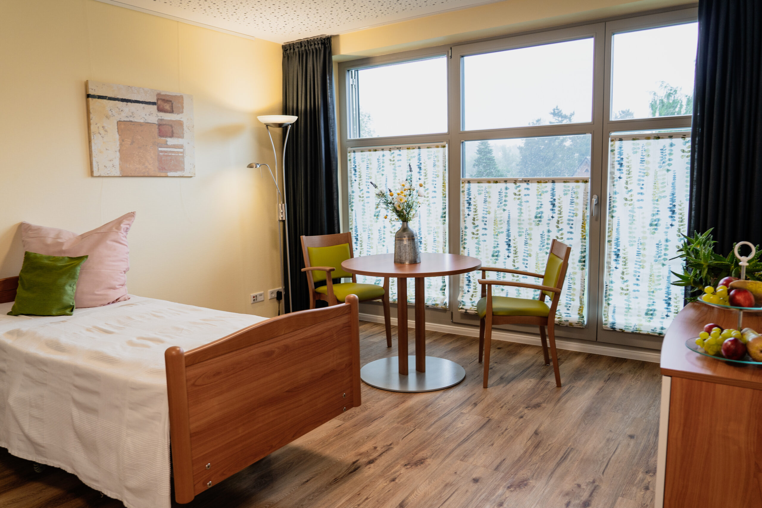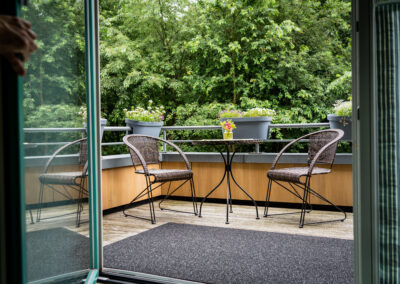 Jedem Gast steht ein geräumiges Einzelzimmer in einer wohnlichen und ansprechenden Atmosphäre zur Verfügung, mit eigenem Bad, TV, Radio und WLAN, sowie Platz für persönliche Einrichtungsgegenstände. Jedes Zimmer verfügt über einen angrenzenden Balkon oder Terrasse, die problemlos mit dem Bett zu erreichen sind. Angehörige und Freunde können jederzeit mittels Beistellbett direkt im Zimmer übernachten.