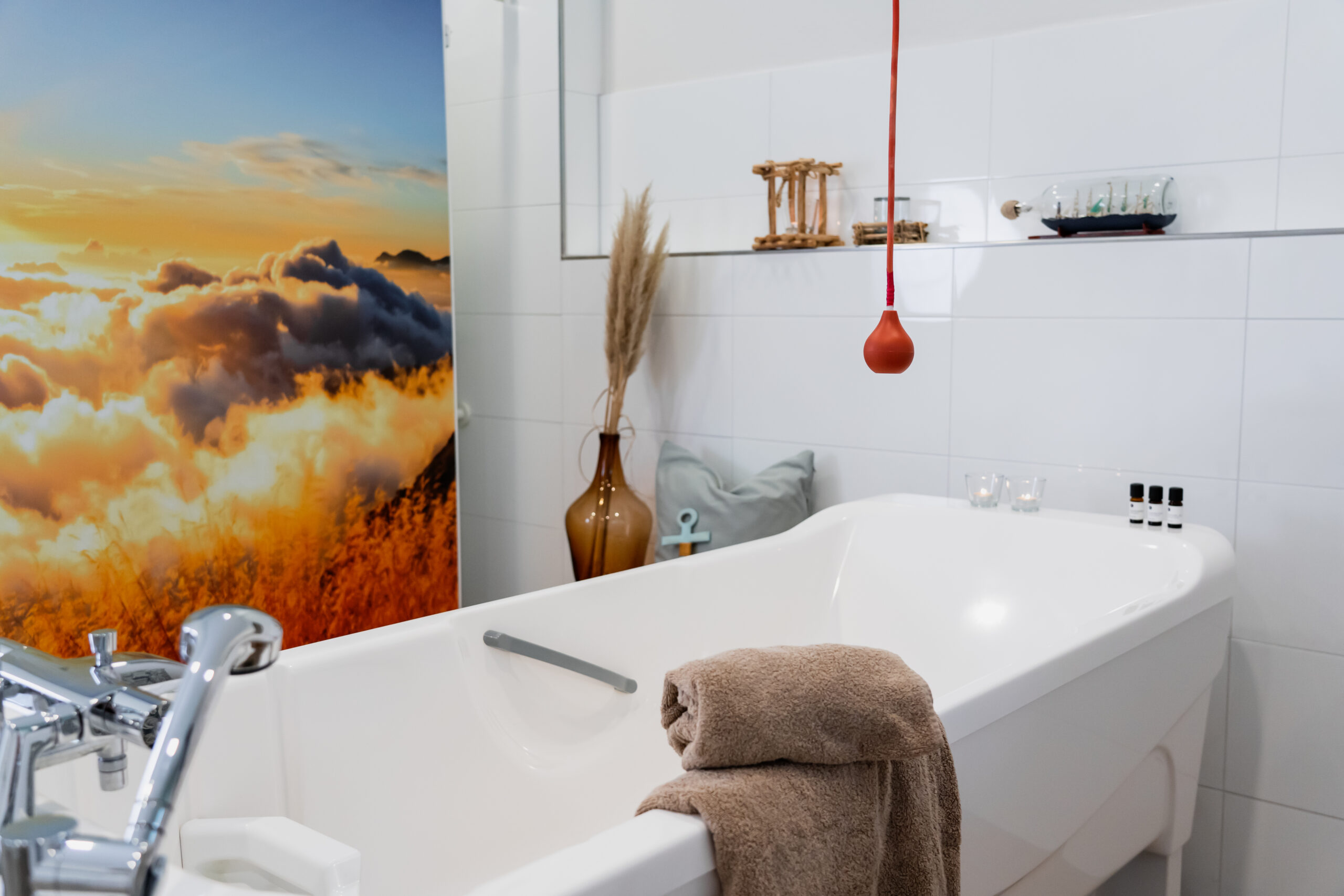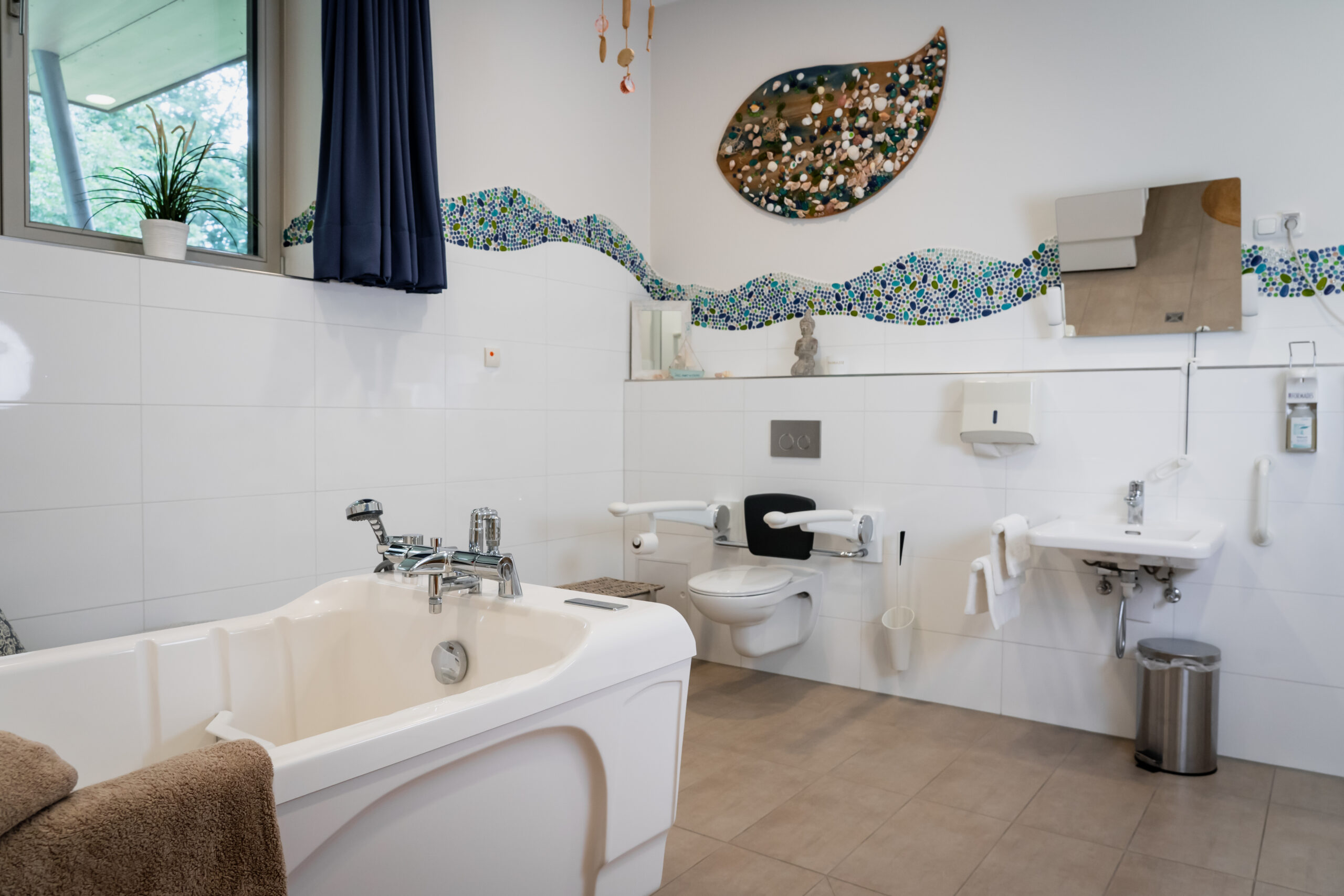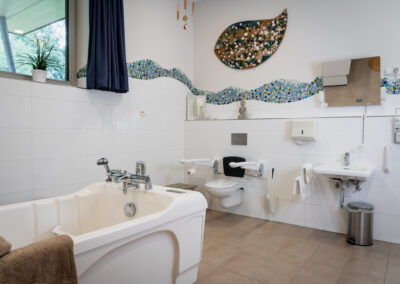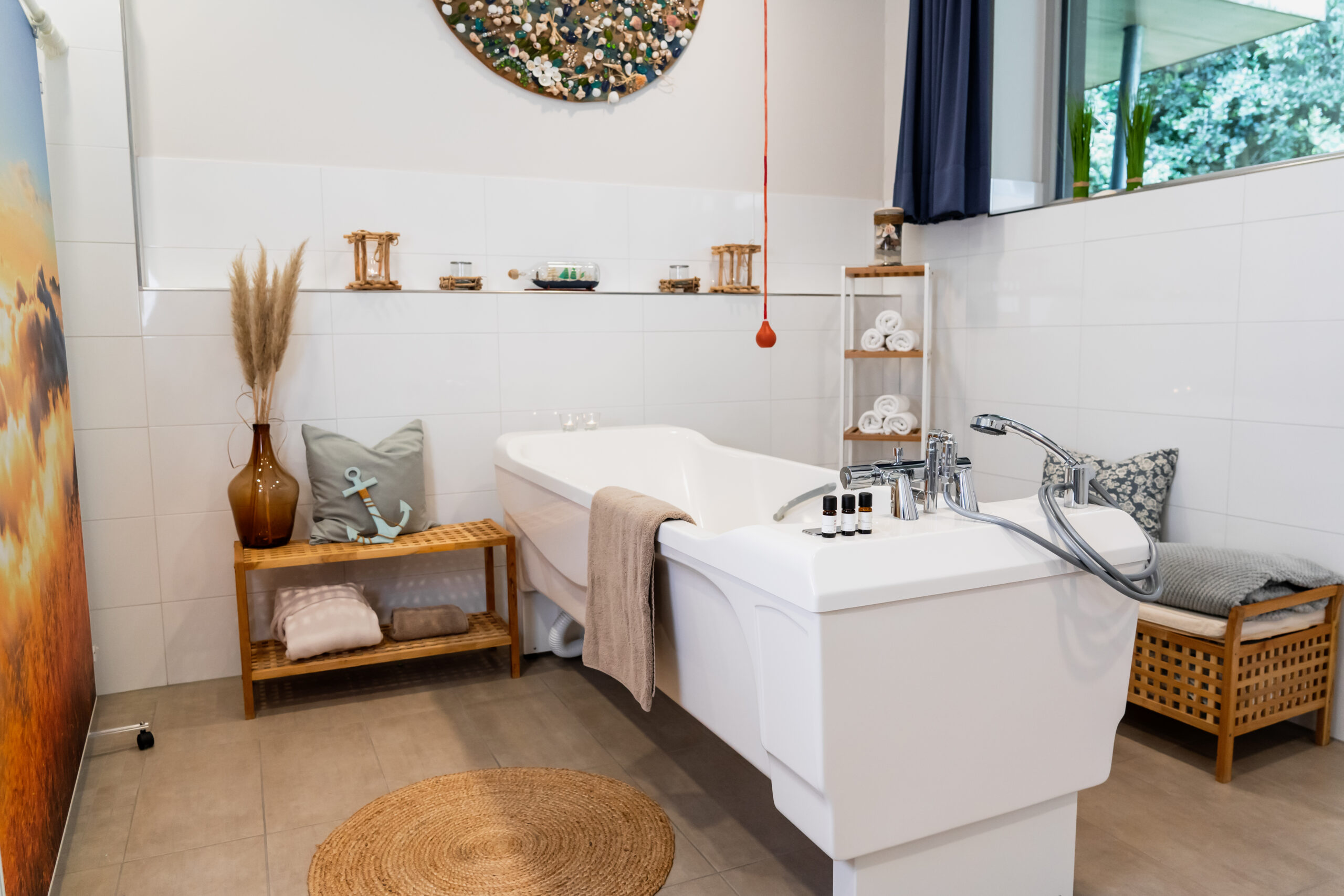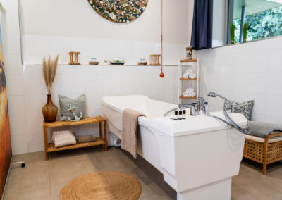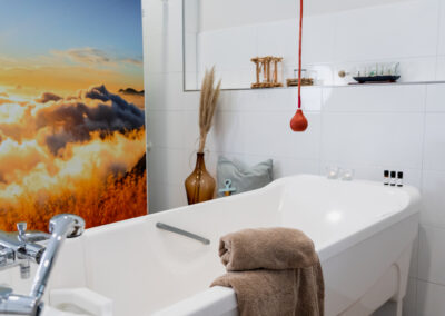 Ein liebevoll eingerichtetes Pflegebad mit Badewanne lädt bei Kerzenschein zu einem entspannten Bad ein.