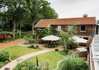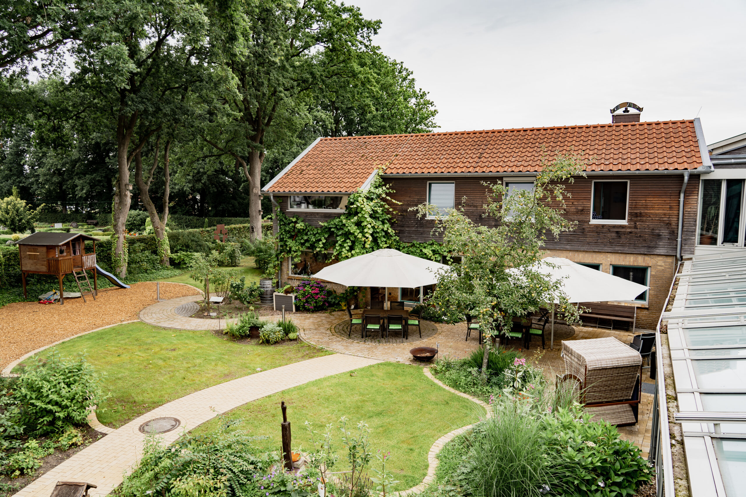Für Kinder steht ein großes Spielhaus mit Rutsche und Sandkiste bereit.